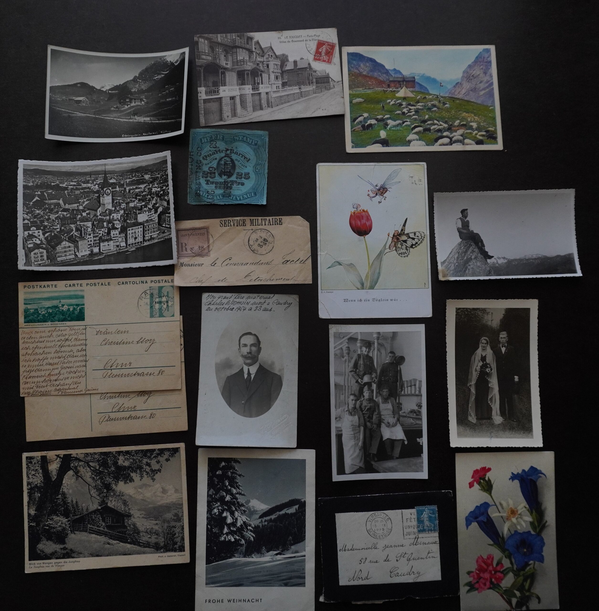 A collection of prints, photographs, cards, letters, and stamps from Winterthur flea market