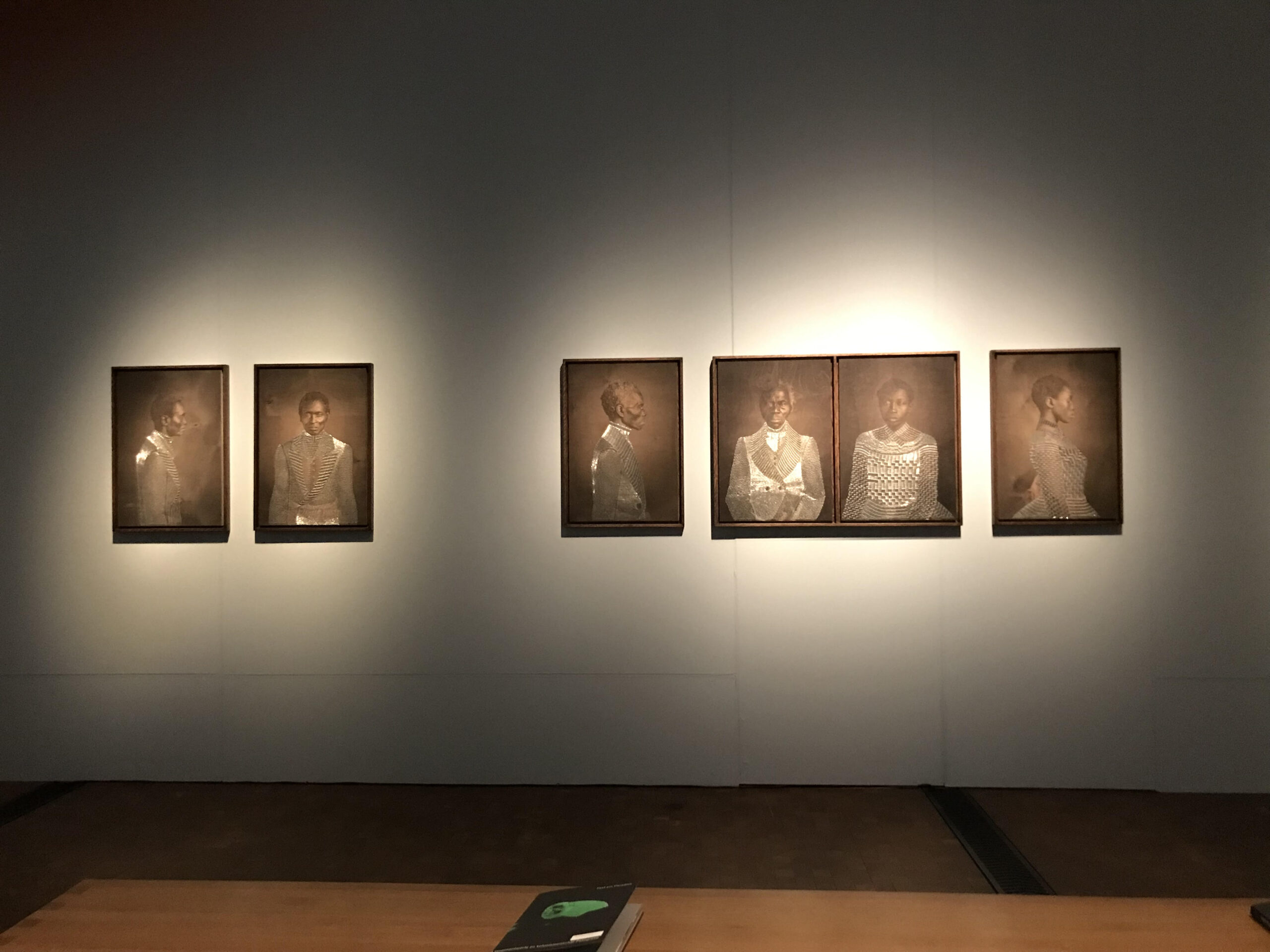 Installation view of Sasha Huber’s work, featuring stapled photographs of enslaved individuals commissioned by Swiss-American naturalist Louis Agassiz
