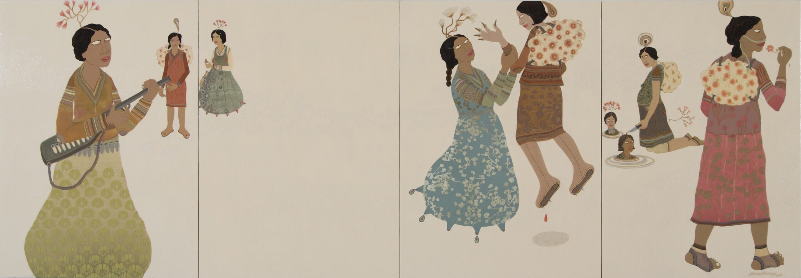 For Acharya, the personal and the political are intertwined. She has said that once you are impacted by the wayward shifts in life, you begin to see the world with greater attention. This awareness began to shape her later works. Her painting Airfare (2008) speaks of the declining air quality, after suffering a wheezing fit while training for a marathon. Nine women drift across four vertical panels, their bodies carrying “breath packs” as they move through a barren landscape. One figure appears to be expecting a child. It is one of several paintings that capture the transformation of a woman’s life during motherhood.