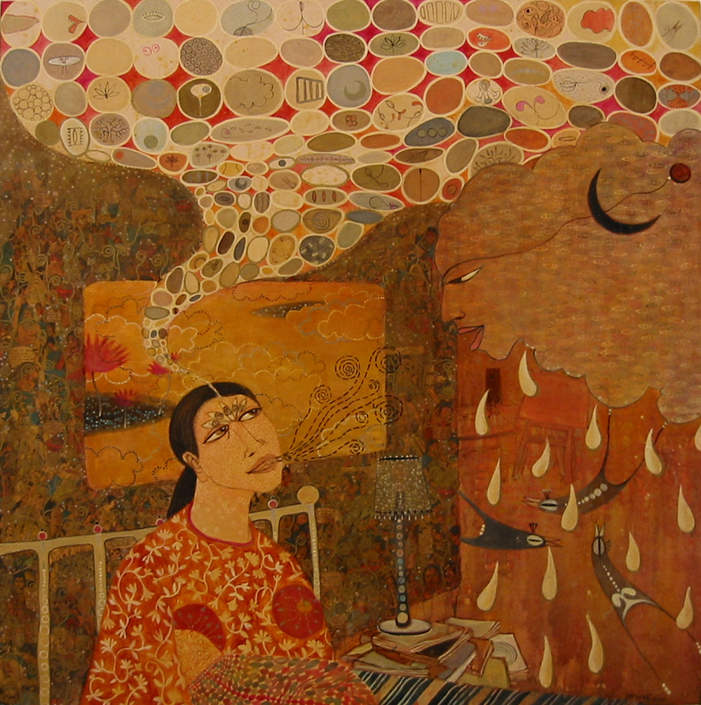 Much like Frida Kahlo, Acharya reveals the inner life and complexity of being a woman. In Awakening (2002), painted while she was expecting her child, a woman rests in bed, leaning against the rails. Her bedside table is busy, her thoughts gently amok, contemplating the many possibilities of her unborn child, while a black crescent moon in the distance witnesses both presence and becoming.