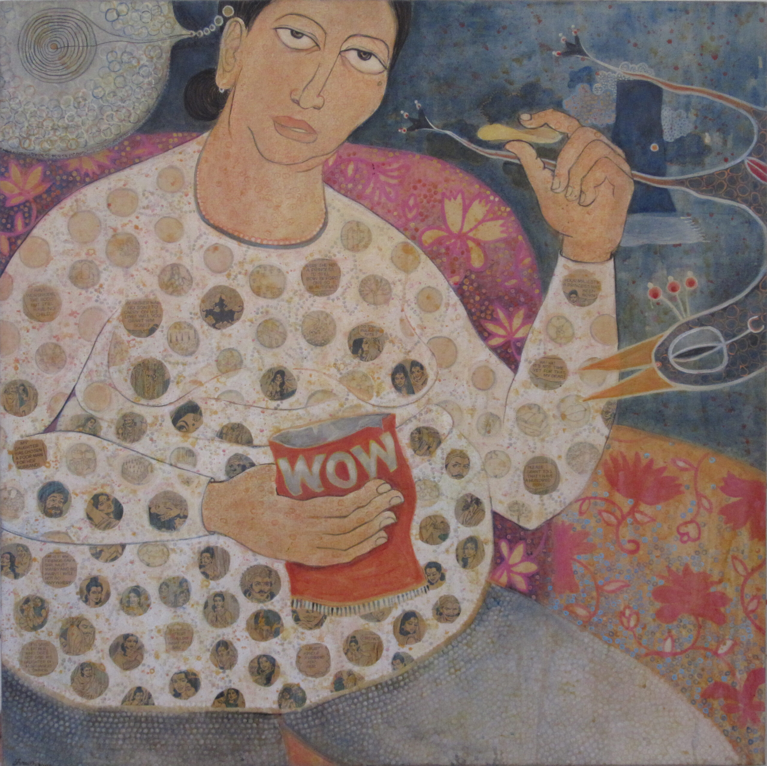 From navigating the expectations of society to eventually discovering the freedom of a new city, Acharya began to question the unseen rules that governed the lives of women. The sense of liberation she found in New York allowed her to look back at the constraints she had known growing up in India. Her painting Captive (2000), made two years after her move, reflects this questioning. A bright red packet of chips, held by a large woman on a flowery couch, speaks to the pressure women face about their bodies. The image is both humorous and tender, revealing how deeply such expectations run. The artist portrays what many of her friends and relatives experienced: the quiet insistence that a woman must be the “perfect” size to find a husband.