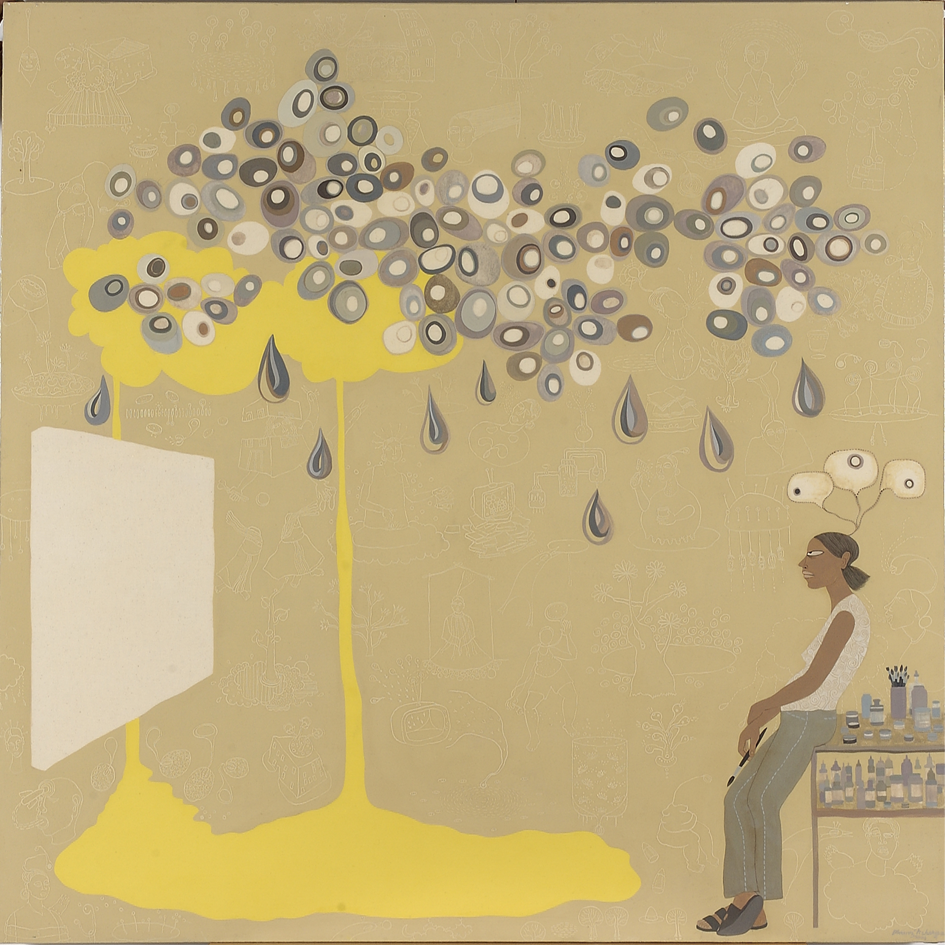 In a sea of beige, grey droplets appear. Ripples of black, white, and milky brown circle within. On one end of the spectrum, a woman leans on a stacked table, paintbrush in hand. At her horizon lies a daunting canvas. This work, titled Paint (2004), is a defining example of Dhruvi Acharya’s practice. The viewer is drawn into Acharya’s world through her compositions. Your eyes wander through the ripples and shifting forms as they move around the figures that anchor and carry her message. At times, words emerge, fragments of conversations that seem to belong to another time, borrowed from the Indian comic Amar Chitra Katha, are placed playfully beside her figures.