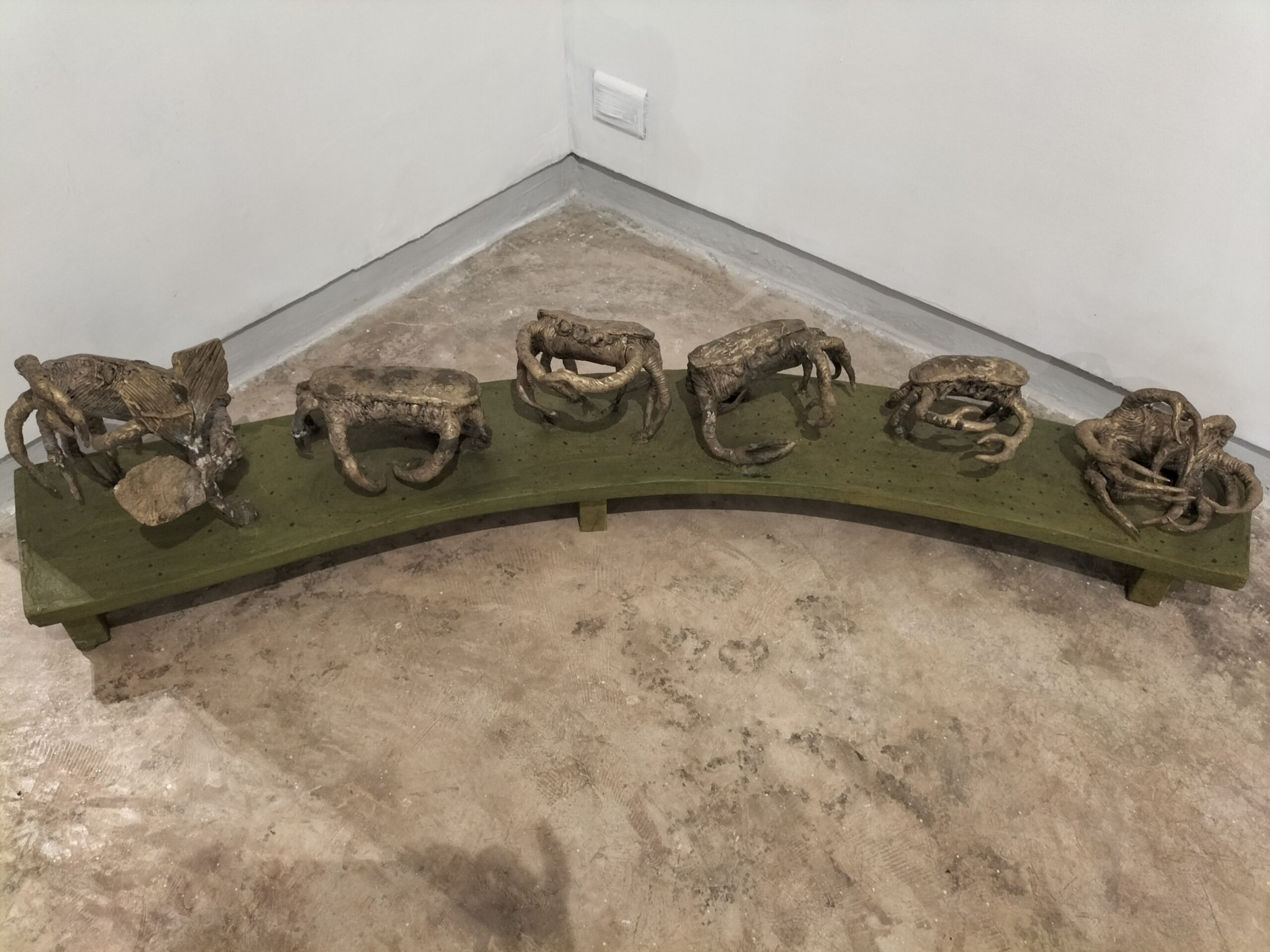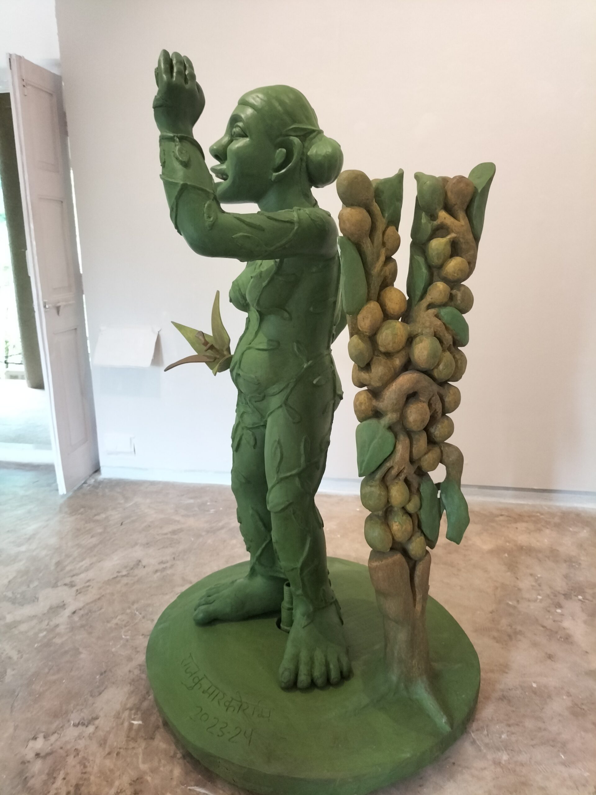 The wood and iron sculptures Mati Aya, Mother Earth and Tigress, Pride of the Country, Queen of the Jungletake on ecological allegory directly, presenting animals, plants and goddesses as both precarious and instructive figures whose contours have the animated spontaneity of sketches. The sculptures are painted in a muted green with a waxy finish reminiscent of mature leaves rather than the bright, glistening shades of a tropical forest, pointing to a subdued endurance of vegetation under pressure. These choices ensure that the ecological concerns at stake are not aestheticised into beauty, but held at a level of unease, encouraging sustained reflection rather than fleeting admiration.