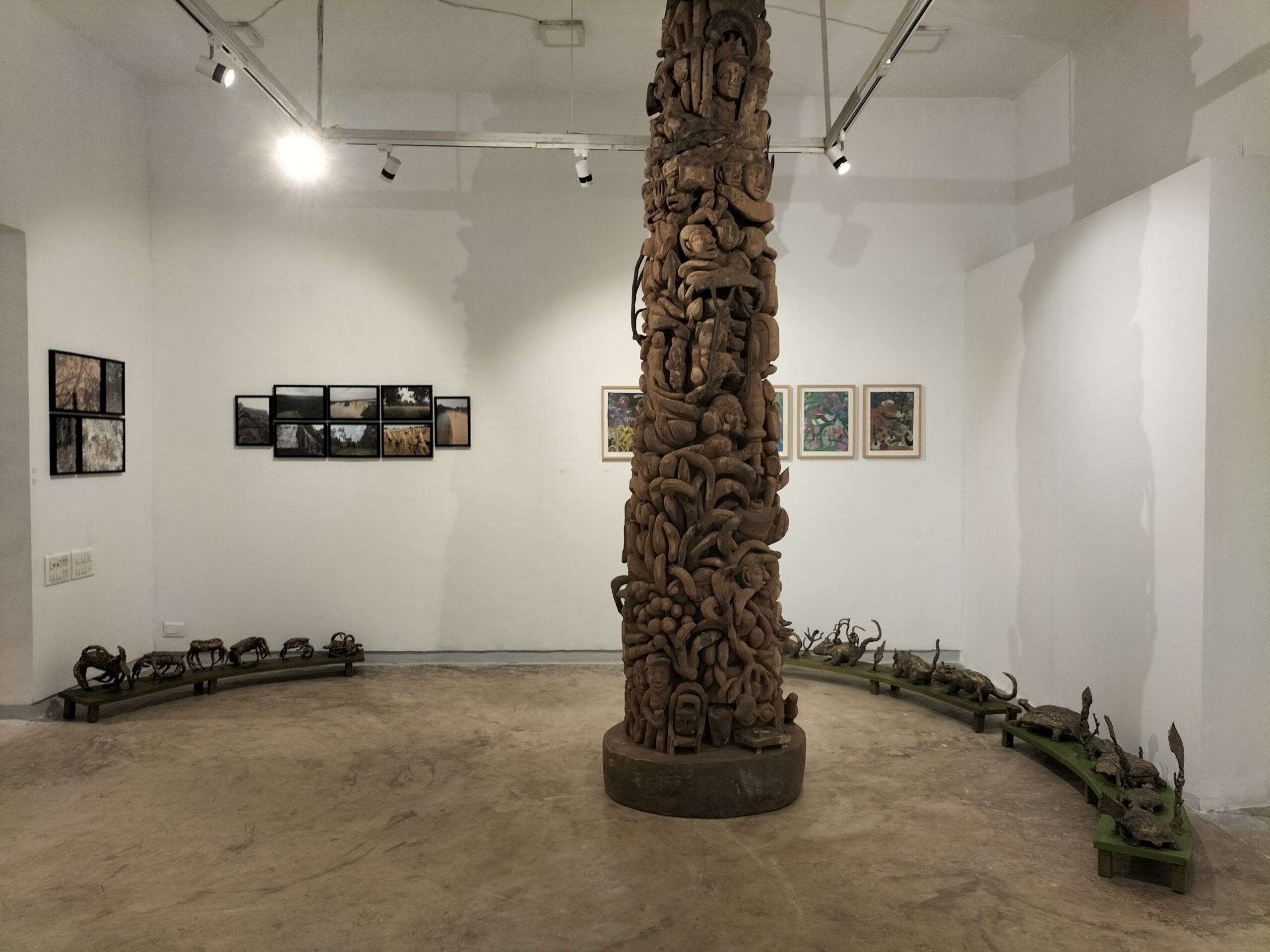 The three wooden Khambas (pillars) stand at the centre of the exhibition, their columnar bodies resembling the entangled growth of a banyan tree’s trunk. Each is carved with stories arranged from base to top, compressing ecological, social and spiritual registers into a single form. The Khamba has become a shared motif among DIAA artists, and is broadly based on the memorial pillars made by the local Dandami Maria tribe. The Khambas brim with stories and symbolism and are consequently densely carved, to the point where it is difficult to discern a clear narrative from the sequence of images without verbal guidance from the artist. This is a common feature among narrative art forms practiced by indigenous communities across the country (such as Phad or Cheriyal), where such imagery are not mute objects but illustrations that are decodified by a performer before an audience. This is contrasted with the bow and arrow more typical of pre-industrial hunting practices in the area, which operated at a slower pace, allowing nature to recover and maintain ecological balance.