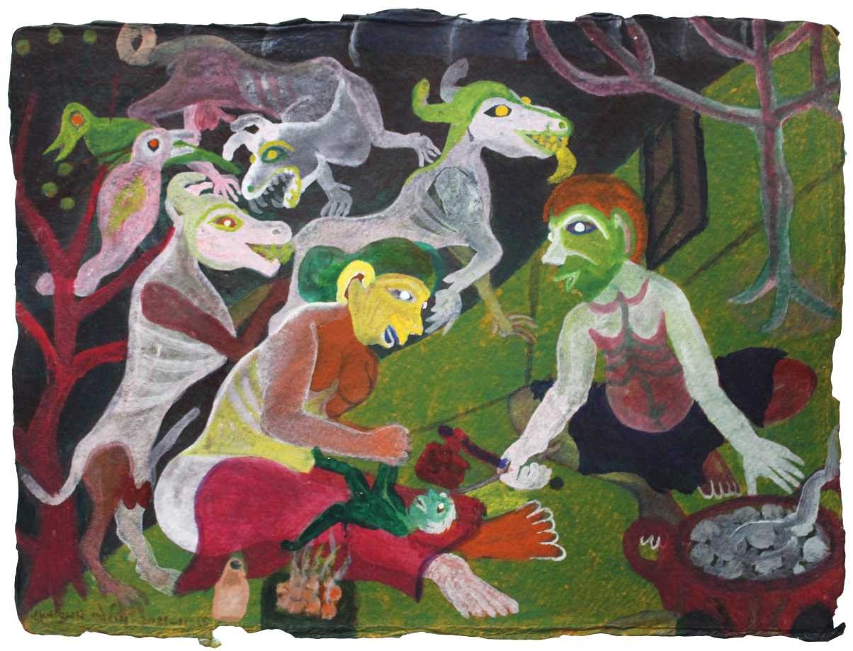 If the Khamba(s) function as vertical accumulations of narrative, the twenty-five acrylic and watercolour paintings depict snippets of life in Bastar. The humans, animals and spirits in these works, enveloped by an ever-present forest, are equal in scale, dissolving both perspective and hierarchies of size. Many of the figures are zoomorphic, unsettling the viewer with colourful eyes, broad smiles and wide-ranging skin tones. The paintings evoke hallucinations, emphasising the psychic potential of a life close to nature and by implication the discomfort experienced when one can only view it from a distance. Fear, of spirits, becomes a way to approach the ecological collapse already underway, refusing to let it remain abstract.