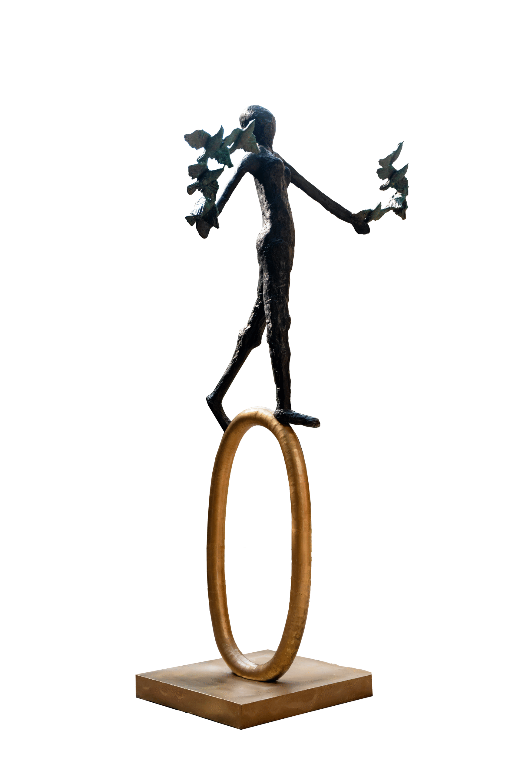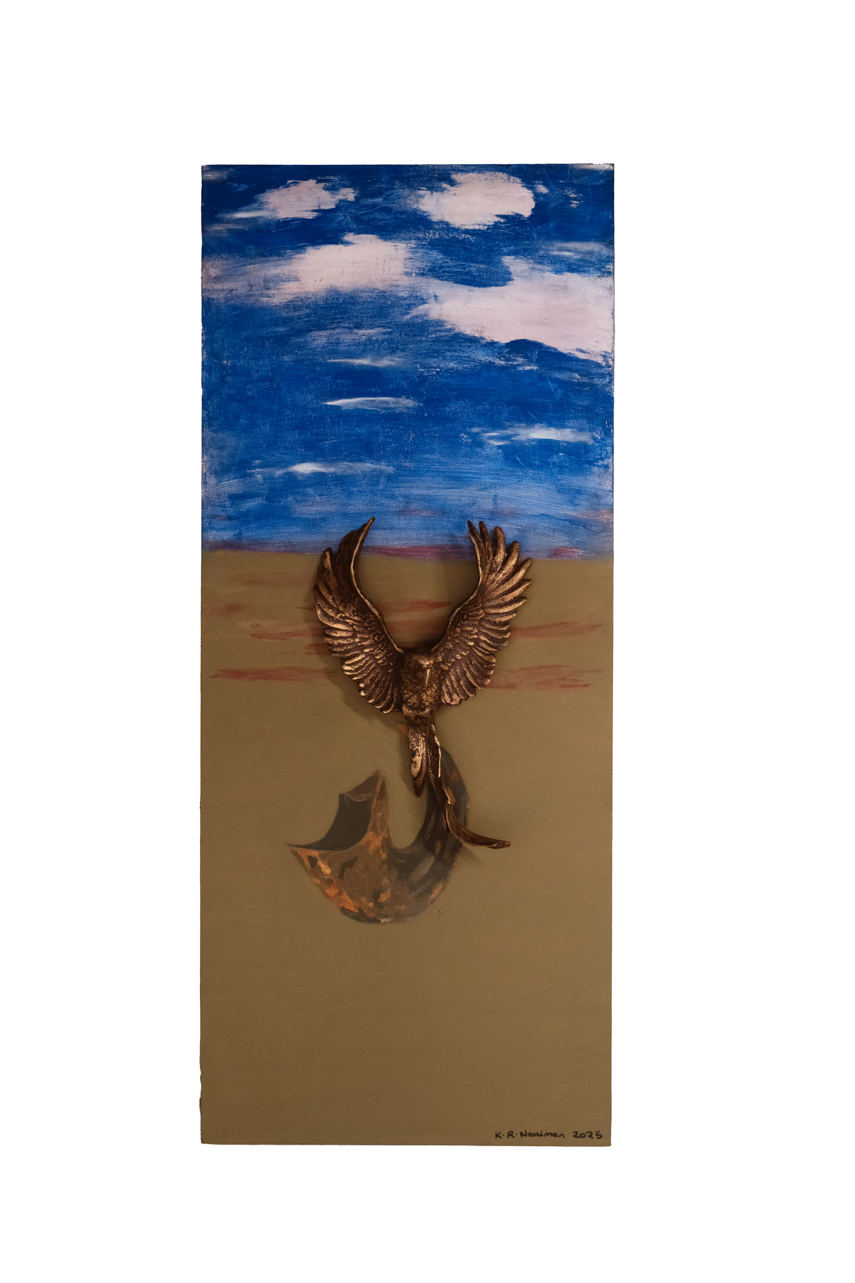The interconnectedness of life: human, animal and mineral is a recurring theme through Nariman’s works. Most of the 160 pieces on display are fashioned in bronze, a material she has been drawn to ever since beginning her practice in 2013. What’s new, however, are her works marrying bronze sculpture with painted canvas, a technique she took three years to perfect. She also plays with multimedia by projecting films on to her mixed media canvases, in turn imbuing them with life. It isNariman’s attempt at portraying the three-dimensional nature of existence. Squawk.Image Courtesy: K. R. Nariman.